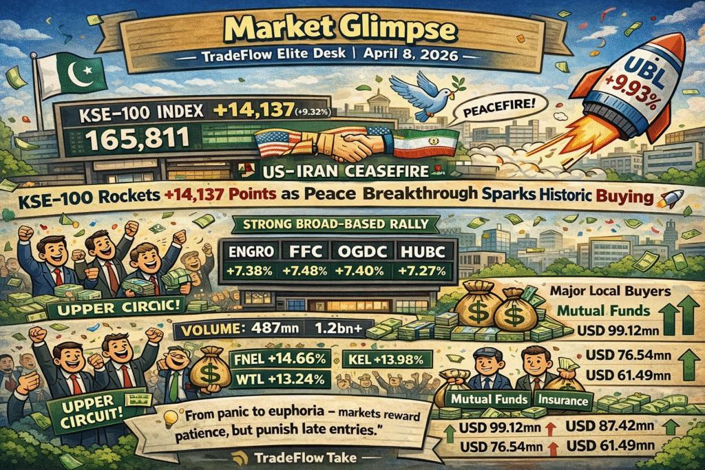 Market Glimpse — TradeFlow Elite Desk | April 8, 2026 The PSX staged a powerful rally today as the benchmark KSE-100 Index surged 14,137 points (+9.32%) to close at 165,811, driven by a sharp improvement in investor sentiment following the announcement of a US-Iran ceasefire agreement. The development triggered aggressive value buying across the board, […]