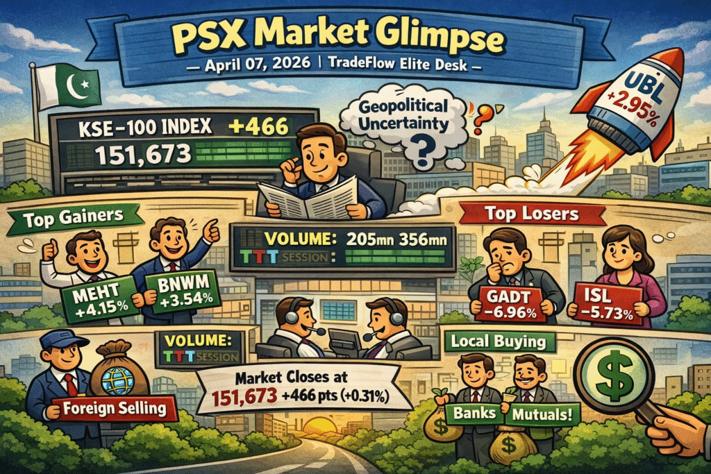 PSX Market Glimpse — April 07, 2026 | TradeFlow Elite Desk The Pakistan Stock Exchange witnessed a subdued yet positive session, as cautious buying helped the benchmark KSE-100 Index gain 466 points (+0.31%) to close at 151,673. The market remained largely range-bound, reflecting a lack of strong conviction amid ongoing geopolitical noise and macroeconomic uncertainty. […]