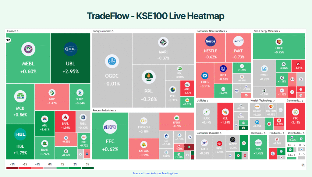 Despite early volatility, selective accumulation in blue-chip stocks supported the index, with investors positioning ahead of the upcoming corporate results season. UBL stood out as a major index contributor, adding significant points to the benchmark with a strong +2.95% gain, alongside support from other heavyweights, helping the index maintain its upward bias.