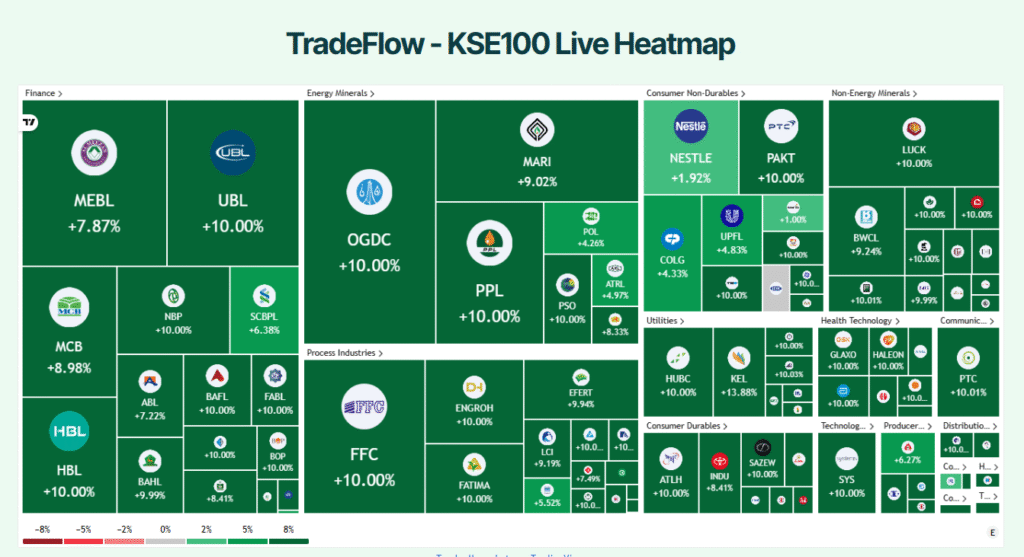 The rally remained broad-based, with Banking, Fertilizer, and E&P sectors leading the advance. Key index contributors included UBL, ENGRO, FFC, OGDC, and HUBC, with UBL playing a major role in lifting the index, reversing its earlier drag and emerging as one of the top movers.