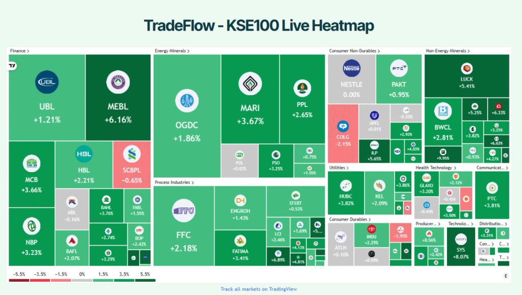 The Pakistan Stock Exchange extended its recovery today, with the KSE-100 Index posting a strong gain as improving global cues and easing geopolitical tensions encouraged broad-based buying across key sectors. Positive momentum in banking, fertilizer, and energy stocks helped sustain the rally, reflecting renewed investor confidence and selective institutional accumulation.